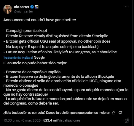 Este mismo hecho está relacionado con un tema que destaca Nic Carter, destacado analista y defensor de Bitcoin. Para él, uno de los puntos más destacados del anuncio es el reconocimiento oficial de Bitcoin por parte del gobierno de los Estados Unidos.