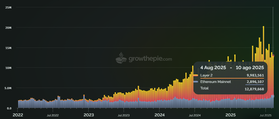 Entre el 4 y el 10 de agosto, casi 13 millones de cuentas interactuaron con el ecosistema Ethereum: 9.9 millones lo hicieron en L2 y menos de 3 millones en L1.