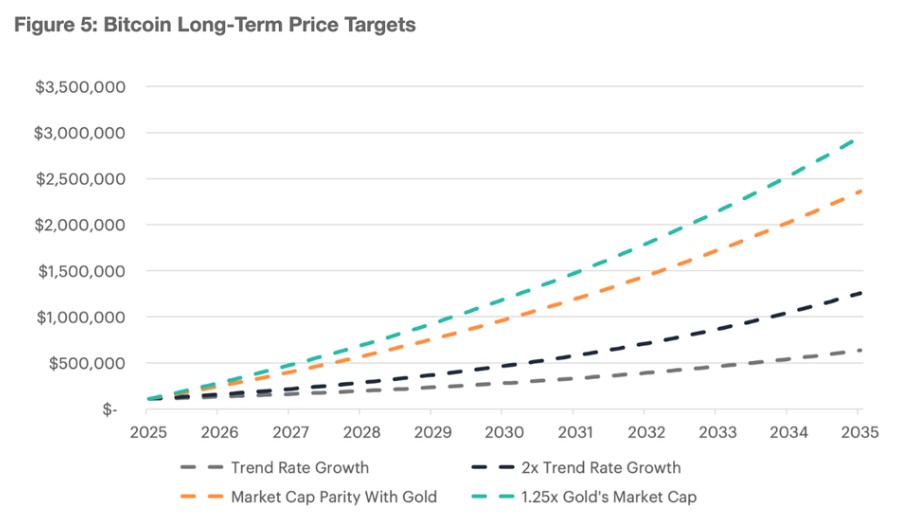 Esta estructura permite a los gestores de capital mitigar riesgos mientras exponen el capital al crecimiento de BTC, tal como se proyecta en el siguiente modelado de escenarios institucionales. Los escenarios basados en oro (naranja y turquesa) son los más ambiciosos, ya que posicionan a bitcoin como un competidor directo del oro como reserva de valor.