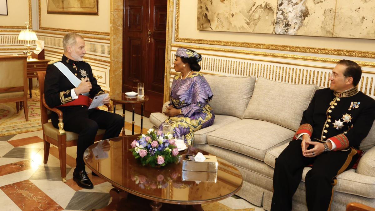 El Rey ha recibido este viernes las cartas credenciales de seis nuevos embajadores, los representantes de Argentina, Angola, Senegal, Guatemala, Suiza e Islandia, en una ceremonia que ha tenido lugar en el Palacio Real de Madrid y en la que, después de más de año y medio sin asistir, ha estado presente el ministro de Asuntos Exteriores, José Manuel Albares.