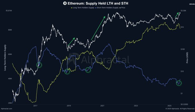 Como se ve en el siguiente gráfico, basado en datos de Alphractal, la oferta de ETH mantenida por LTHs y STHs muestra fluctuaciones significativas a lo largo del tiempo, correlacionadas con el precio del activo.