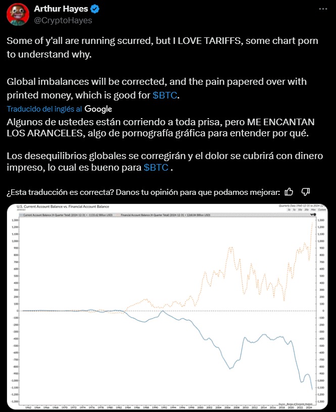 Recientemente, el ex CEO de BitMEX, Arthur Hayes, expresó que, mientras muchos reaccionan con temor, él celebra la guerra comercial impulsada por la administración Trump. Según Hayes, los aranceles podrían forzar una corrección de los desequilibrios globales, aunque de manera desordenada. A su juicio, los gobiernos intentarán amortiguar el impacto imprimiendo dinero, lo que, en última instancia, beneficiará a bitcoin.