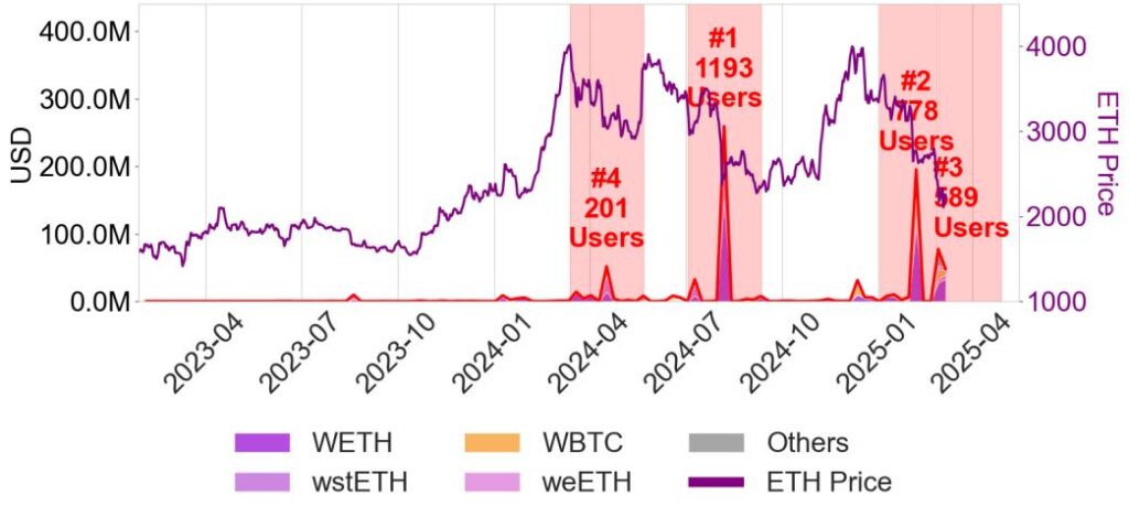 El segundo gráfico permite entender el principal riesgo del sistema. En la visualización, la línea roja representa el volumen total liquidado en dólares, mientras que las áreas de colores debajo corresponden a los principales activos involucrados en esas liquidaciones (como ether (ETH) y versiones envueltas de bitcoin). La línea violeta, por su parte, refleja el precio de la criptomoneda nativa de Ethereum.