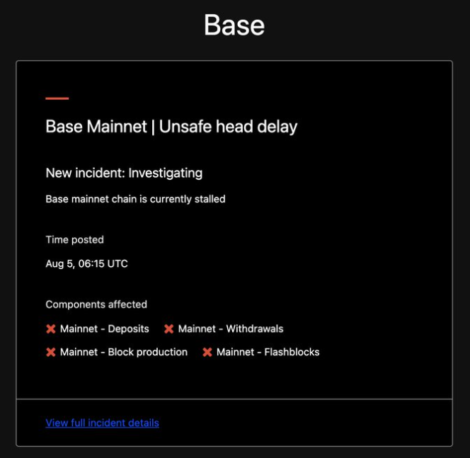 De acuerdo con la web Base Status, fueron 28 minutos en los que estuvo caída la producción de bloques, los retiros, los depósitos, y los flashblocks (una funcionalidad de esta red para procesar bloques más rápidamente).