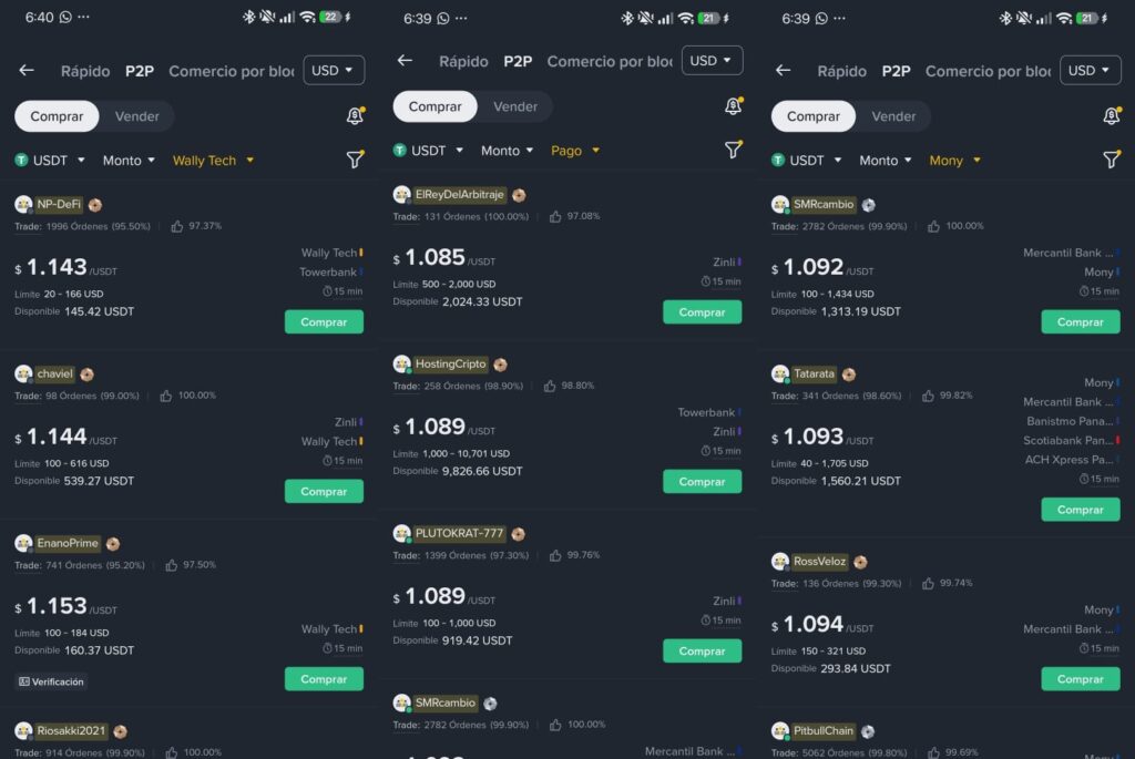 Esta práctica ha saturado la liquidez en las pasarelas de pago panameñas. Según reportes de usuarios y traders, el costo de adquisición de USDT ha pasado de tasas estables de 1,012 a picos de 1,094 y hasta de 1,14 dólares, lo que representa una pérdida de valor inmediata de casi el 10% solo en la ejecución de la compra, superando incluso las comisiones de compra directa con tarjetas de crédito internacionales.