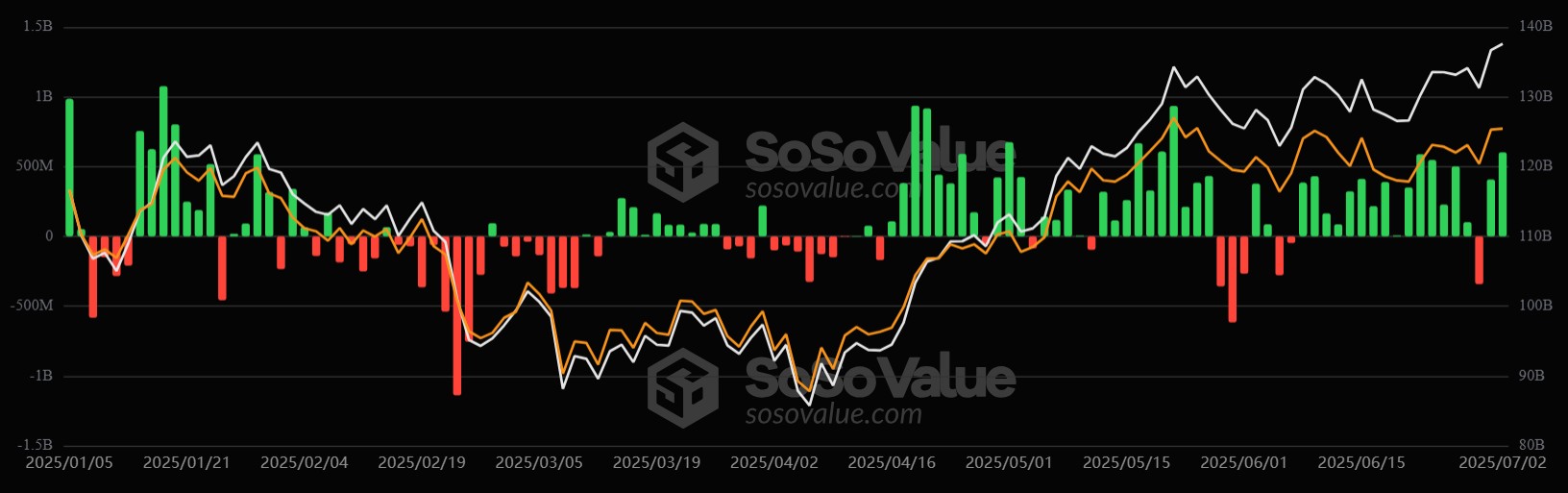 Los últimos dos días, los ETF de bitcoin recuperaron impulso con entradas de 1.000 millones de dólares, superando ligeros tropiezos a comienzos de julio marcados por salidas de 342,2 millones el martes 1 de julio.