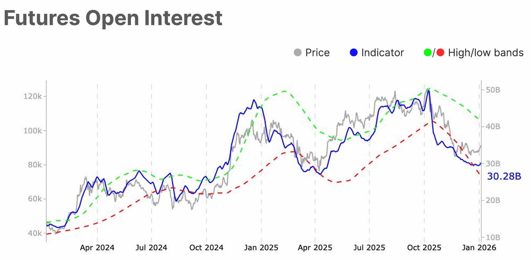 A su vez, los mercados de opciones han reducido el riesgo de forma agresiva, con un interés abierto contrayéndose y diferenciales de volatilidad superando sus bandas estadísticas superiores. Eso significa, para Glassnode, elevada incertidumbre y aumento de las expectativas de volatilidad a corto plazo.
