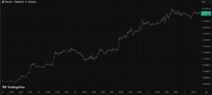 Ahora mismo, bitcoin está en un terreno cercano a su máximo histórico, como se ve en la siguiente gráfica de TradingView.