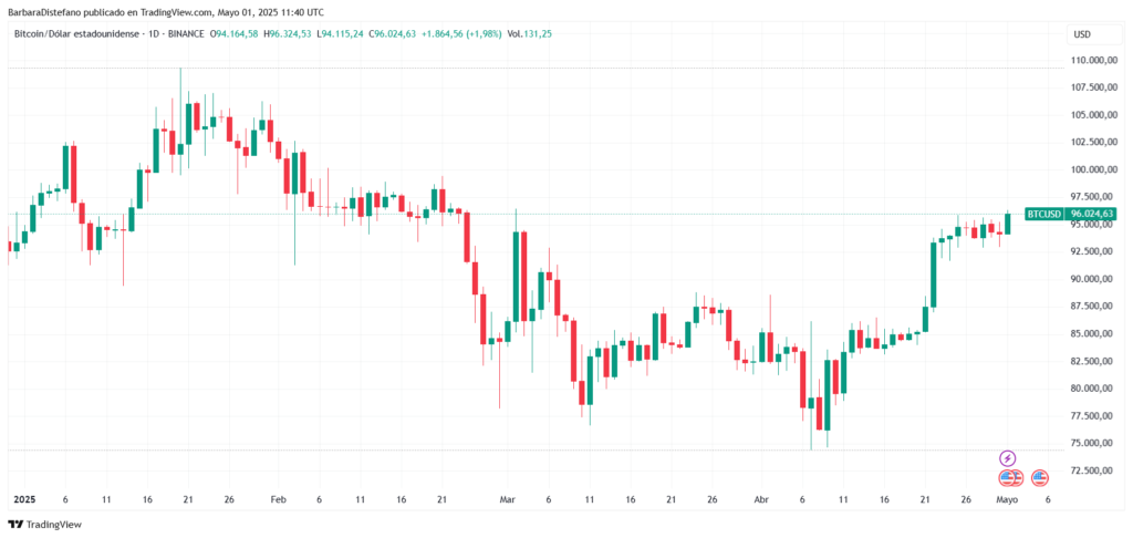 El precio de bitcoin alcanzó hoy los USD 96.000, su máximo en dos meses. Con ello, quedó 10% debajo de su máximo histórico de USD 109.000 registrado hace tres meses, como exhibe el siguiente gráfico.