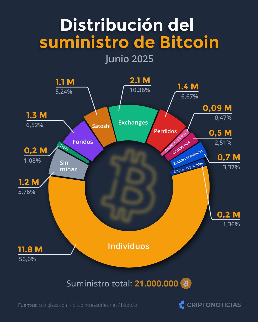 La creencia de que las instituciones superan en tenencia de bitcoins a los individuos se asemeja a la creencia de que el mercado de altcoins en conjunto supera al tamaño del mercado de bitcoin (cuando la realidad es que bitcoin comprende el 64% de todo el valor del mercado de criptomonedas). Estos errores surgen por el ruido mediático. Pero, gracias a la transparencia de la contabilidad de este activo, los datos nos revelan que, por mucho, los individuos siguen dominando en más del 56% de tenencia de los BTC emitidos hasta ahora.