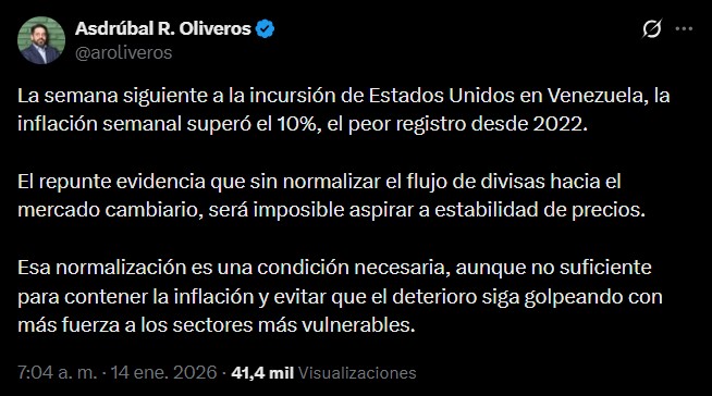 Asdrúbal Oliveros: la inflación semanal de Venezuela superó el 10%