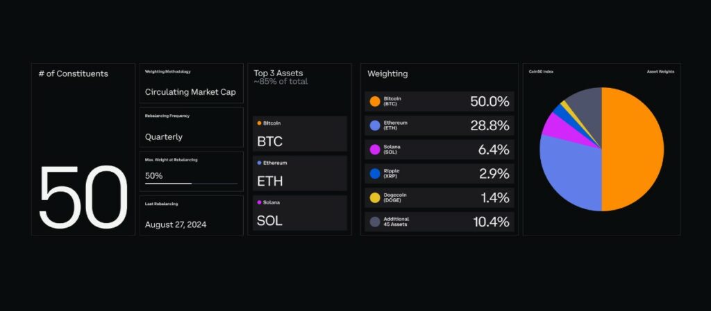 De acuerdo con Coinbase, el índice COIN50 rastrea el rendimiento de los 50 criptoactivos más grandes y líquidos según su capitalización de mercado. Para ello, aplica una serie de criterios fundamentales y de elegibilidad del mercado para asegurar que los activos sean invertibles.