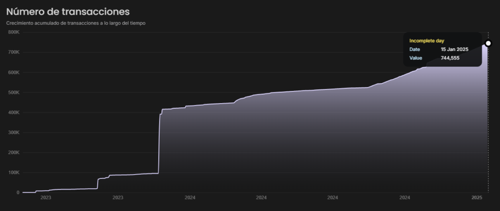 En cuanto a la cantidad de transacciones totales, desde fines de diciembre de 2024 al 15 de enero de 2025 se han ejecutado alrededor de 50.000 nuevas transacciones. Así, esta estadística suma un total de 744.555 transacciones.