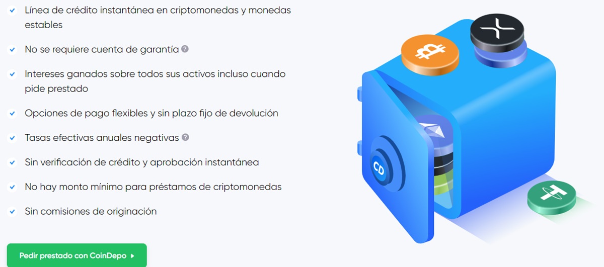 Una característica única de los préstamos en CoinDepo, a diferencia de todos los demás exchanges y plataformas de criptomonedas a los que debería prestar atención, es que no necesita abrir una cuenta colateral o cuenta de garantía y congelar sus criptoactivos en ella para obtener un préstamo. En lugar de eso, todos sus criptoactivos depositados en la plataforma permanecen en cuentas de interés compuesto generándole ingresos por intereses.