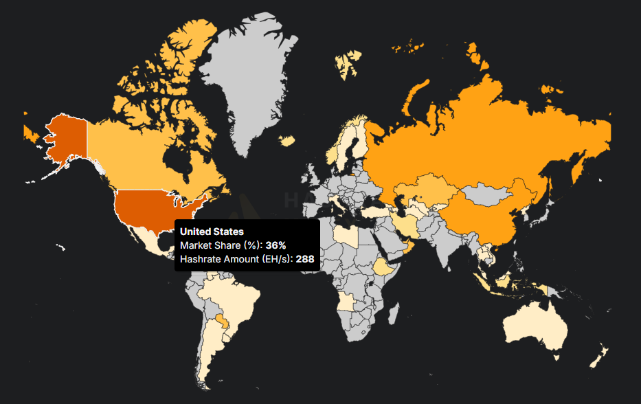 Mineros que operan en Estados Unidos aportan la mayor cantidad de hashrate.