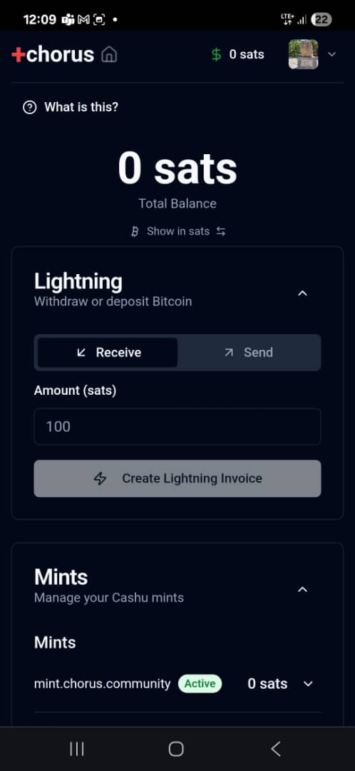 Esta wallet permite enviar y recibir monedas, pero solo a través de la red Lightning: también cambiar la denominación de cálculo de las monedas de BTC a SATS o dólares (USD). A su vez, Chorus tiene ciertas funcionalidades extra, como la de gestionar acuñaciones y transferencias de tokens Cashu, que además se pueden administrar con esta wallet.