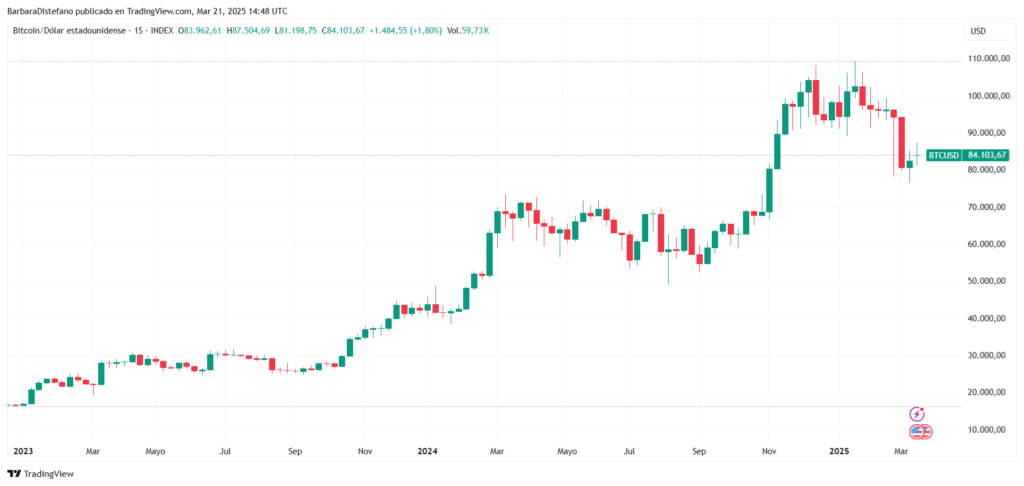 Una subida a USD 125.000 significaría una apreciación de casi 50% desde sus precios actuales alrededor de USD 84.000 y un 14% más del récord histórico de USD 109.300 que marcó hace dos meses, como muestra el próximo gráfico.