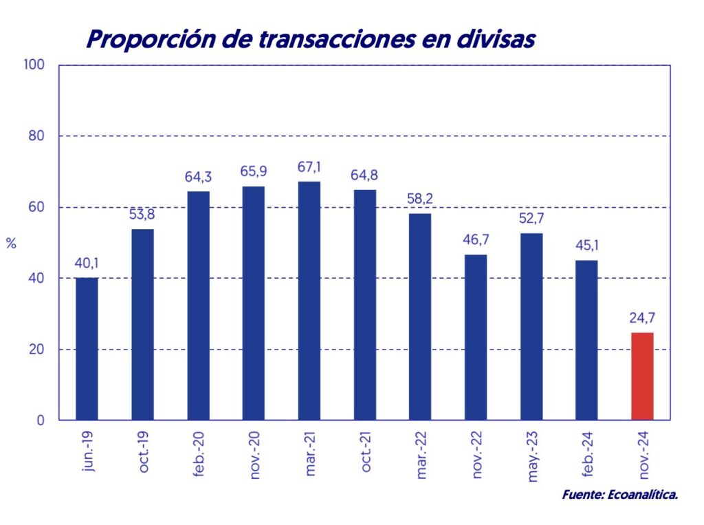 Según el más reciente estudio de la firma de análisis socioeconómico Ecoanalítica, tres de cada cuatro pagos realizados en Venezuela durante el mes de noviembre, se hicieron en bolívares. Así, la dominancia del billete verde cayó a 24,7% durante el onceavo mes del año, algo sin precedentes en los últimos cinco años, según la organización.