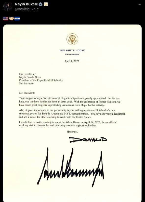 El presidente de El Salvador, Nayib Bukele, compartió recientemente una invitación firmada por su homólogo estadounidense, Donald Trump. En la carta, Trump agradece al gobierno salvadoreño por su cooperación en la lucha contra el crimen y la inmigración ilegal, e invita a Bukele a la Casa Blanca el 14 de abril.