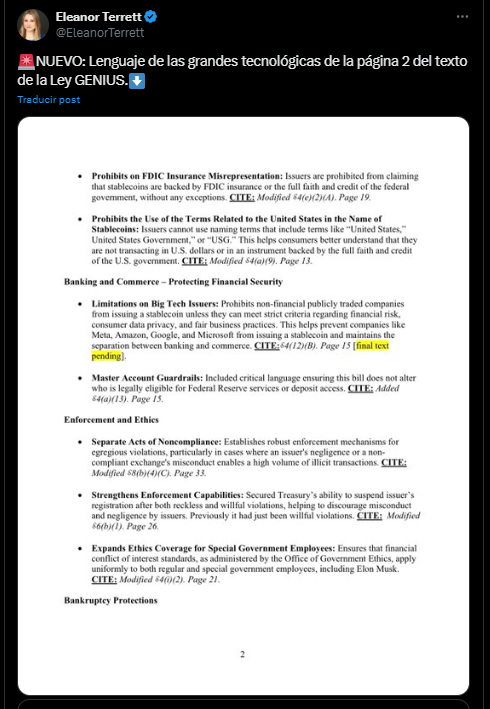Según un tuit de la periodista Eleanor Terrett, el texto de la página 2 del proyecto incluye un lenguaje específico dirigido a las empresas tecnológicas, reforzando la separación entre banca y comercio.