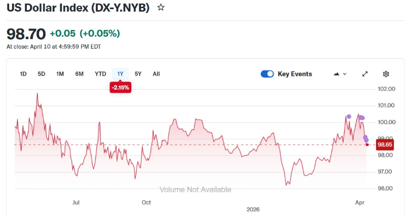 El DXY cerró el viernes 10 de abril cerca de los 98,65–98,70 puntos, alcanzando mínimos de cuatro semanas. El movimiento contrastó con el comportamiento observado durante el máximo del dólar entre febrero y marzo de 2026, cuando el DXY llegó a niveles cercanos a los 100–101 puntos, impulsado por la demanda de activos refugio en medio del conflicto.