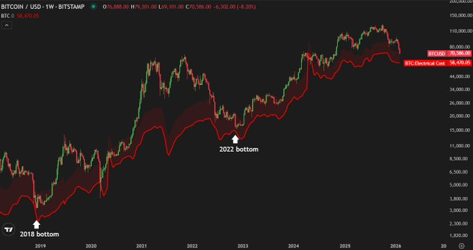 Un factor determinante que sostiene la estructura actual es el costo de producción real. Históricamente, el precio de Bitcoin ha demostrado una incapacidad casi total para permanecer por debajo de su costo eléctrico de forma sostenida.