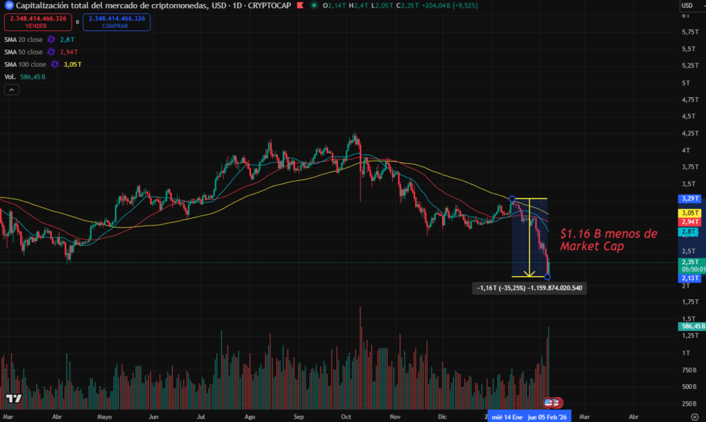 Esta tesis resulta seductora y peligrosa a la vez, especialmente tras observar la violencia técnica de las últimas semanas, donde el mercado de criptomonedas ha perdido aproximadamente 1.16 billones de dólares en capitalización de mercado desde el pasado 14 de enero.