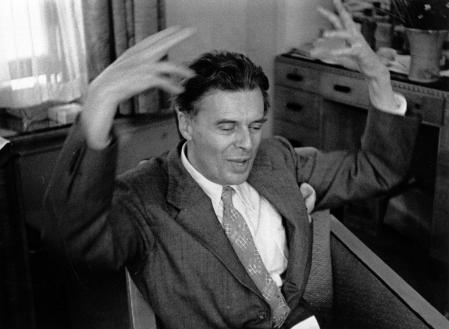 El novelista Aldous Huxley, autor de ‘Un mundo feliz’, gesticula durante una entrevista