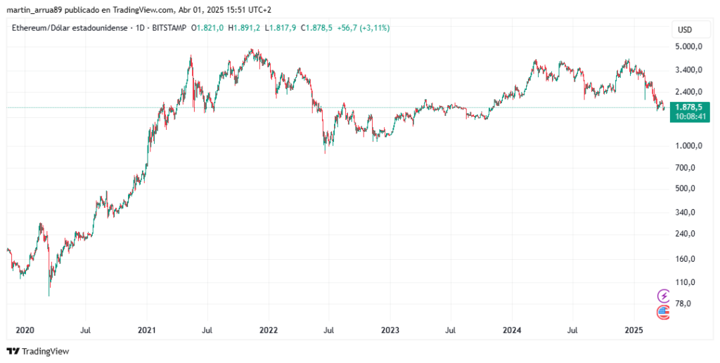 Al momento de la publicación de esta nota, el precio de la criptomoneda nativa del ecosistema Ethereum es de 1.870 dólares, un 61% por debajo de su máximo histórico (ATH) de 4.890 dólares, alcanzado en noviembre de 2021.