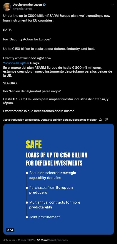 El ambicioso plan anunciado por Ursula von der Leyen, que implica un programa de préstamos de 150.000 millones de euros (más de 160 millones de dólares) para adquirir armamento producido exclusivamente en Europa. No es una apuesta solo militar, sino también económica, ya que busca fortalecer una industria de defensa propia que pueda competir con gigantes estadounidenses y reducir la salida de capitales hacia empresas extranjeras, algo que se evidencia en el dato de que dos tercios de los pedidos de los miembros europeos de la OTAN han ido históricamente a compañías de EE.UU.