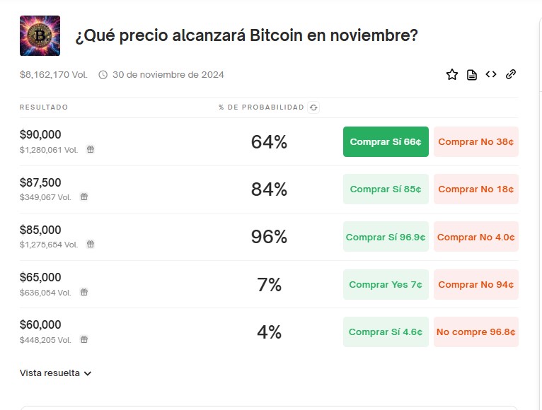La primera de estas apuestas, titulada “¿Qué precio alcanzará bitcoin en noviembre?”, es la que más interés ha generado, sumando hasta ahora 8,16 millones de dólares en apuestas al cierre de este reporte.