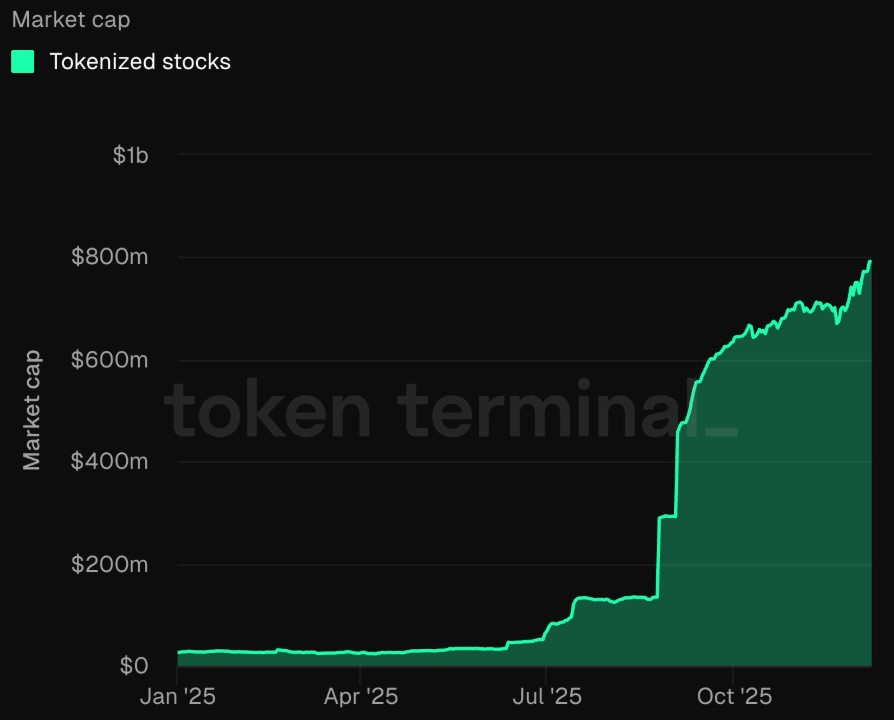 Dentro de ese universo, las acciones tokenizadas marcaron un máximo histórico cercano a los USD 800 millones. Esto, con un crecimiento de casi 30 veces en lo que va del año. Así se ve en la siguiente gráfica: