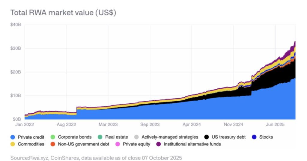 Los datos de CoinShares muestran que la mayor parte del valor de los RWA se concentra en Ethereum y sus redes de segunda capa. El segmento de mayor crecimiento es el crédito privado, impulsado por empresas que ofrecen préstamos con garantía inmobiliaria que pueden liquidarse en días en lugar de meses.