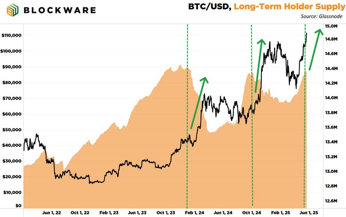 El siguiente gráfico proporcionado por Mitchell permite profundizar en esta dinámica. La imagen muestra la evolución del precio de bitcoin frente al dólar estadounidense (BTC/USD, con la línea negra) desde enero de 2022 hasta mayo de 2025, junto con la cantidad de bitcoins que no se han movido en todo ese período (área naranja), representada en millones en el eje derecho.