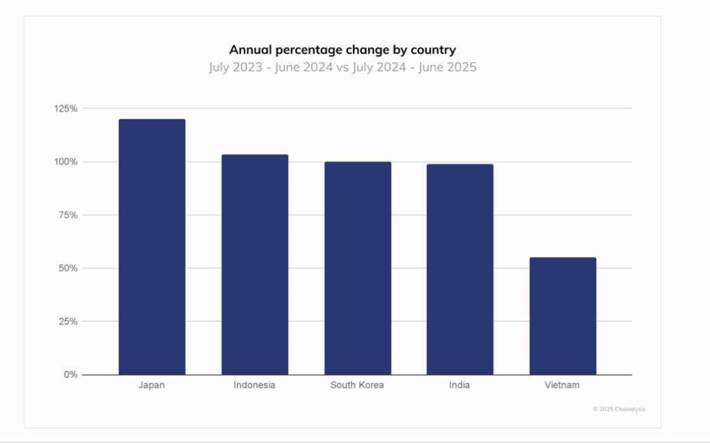 Japón registra el mayor crecimiento anual en actividad de criptomonedas entre los principales mercados de Asia, con un incremento superior al 120%, Fuente: Chainalysis