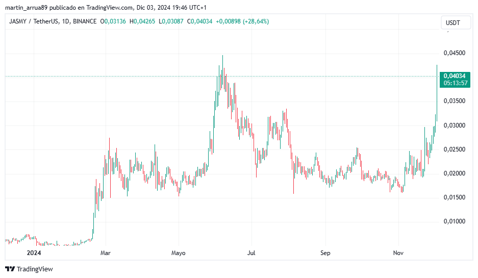 Al momento de la publicación de esta nota, su cotización es de 0,04 dólares, lo que representa una subida mensual de 136%. Sin embargo, el precio de JASMY está muy lejos de los 4,99 dólares, el máximo histórico (ATH) que marcó en febrero de 2021.