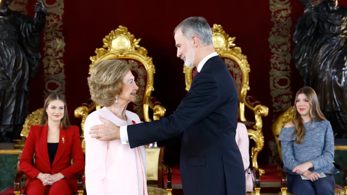 El rey Felipe impone el Toisón de Oro a su madre la reina Sofía, durante el acto de conmemoración del 50 aniversario de restauración de la monarquía