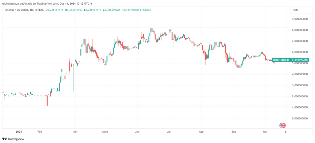 Desde el 1 de enero de 2024, cuando TON cotizaba a un promedio de 2,20 dólares, su valor ha aumentado más de un 127%, alcanzando actualmente los 5,3 dólares, como se observa en el siguiente gráfico de TradingView.