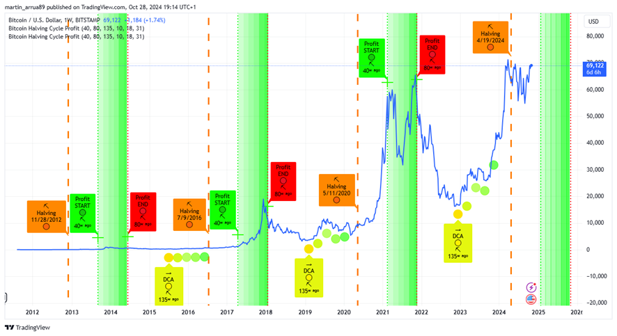 En el indicador Bitcoin Halving Cycle Profit de TradingView, se observa que el ciclo alcista podría comenzar en los primeros días de enero de 2025 (zona coloreada de verde). En el gráfico se ve representado con un cuadrado y una línea punteada naranja el inicio del evento de reducción, en verde el comienzo de la denominada zona óptima de mayor rentabilidad y, en color rojo, el final de ese período.