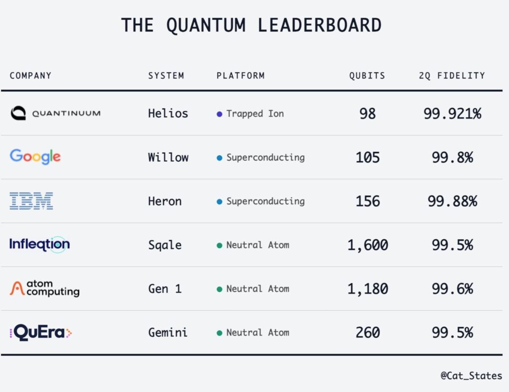 - QuEra (Gemini): 260 cúbits con 99,5% de fidelidad.