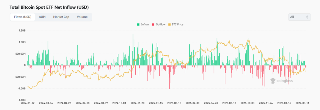 En el siguiente gráfico, por ejemplo, observamos como los ETF de bitcoin registraron salidas netas consecutivas de aproximadamente 164 millones de dólares el 18 de marzo, 90 millones de dólares al día siguiente y 52 millones de dólares el 20 de marzo. Todo esto es actividad de trading vinculada al precio de bitcoin, pero que no tiene necesariamente impacto inmediato a nivel on-chain (aunque pudiera tenerlo si los gestores de ETF compran o venden bitcoin para respaldar sus acciones o redimir a inversionistas).