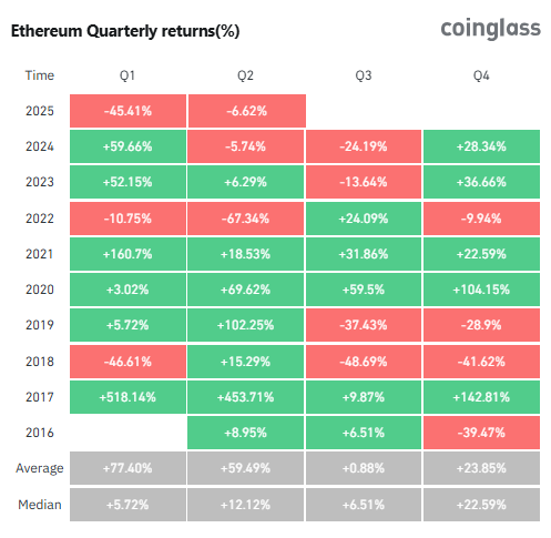 Es la tercera vez en su historia que ETH cierra el primer trimestre de un año en rojo. Según datos de Coinglass, una firma de análisis de datos on-chain, esto ocurrió en 2018 (-46,61%) y en 2022 (-10,75%).