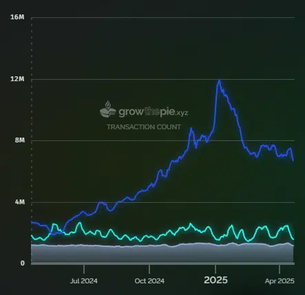 En el siguiente gráfico del sitio Grow the pie, se observa que desde abril de 2024 el número de transacciones en Base (línea azul en el siguiente gráfico) y Arbitrum (línea verde) ha superado a las registradas en la cadena principal de Ethereum (línea gris).