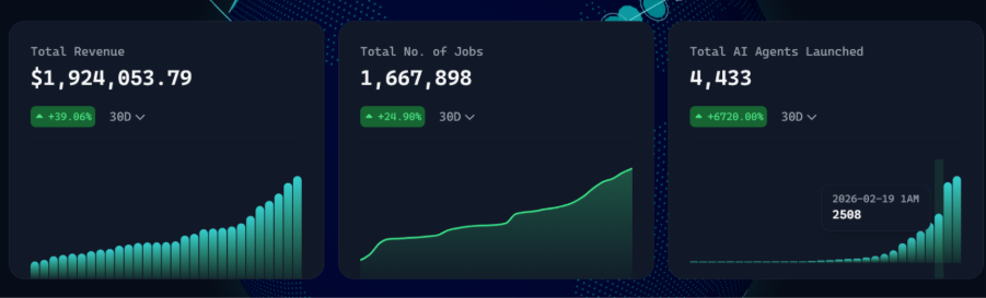 Virtuals Protocol es probablemente el proyecto más maduro en la creación de una economía de agentes, con más de 4.000 agentes de IA lanzados y un PIB de agentes (que mide la producción económica agregada de agentes autónomos de IA) total de casi 2 millones de dólares a febrero de 2026.