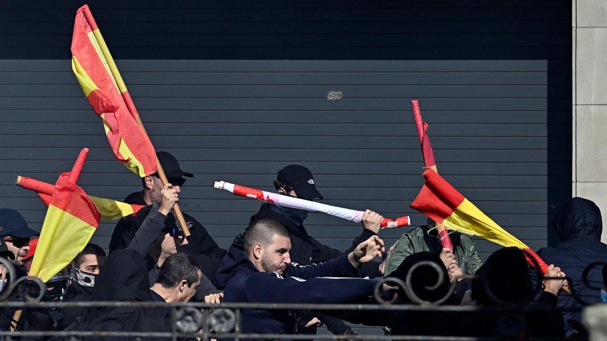 Simpatizantes de la Falange Española (izq.) se enfrentan con contramanifestantes antifascistas (der.)