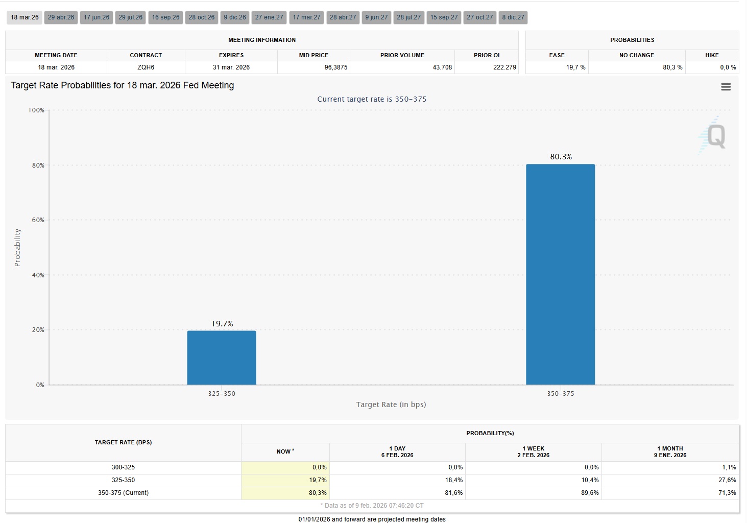 Según el sondeo de CME, existe un 80% de probabilidades de que las tasas se mantengan sin cambios en el rango de 350 a 375 puntos básicos en la próxima decisión. El resto vaticina un recorte de 25 puntos. En este sentido, la posibilidad de recortes no se ve sino hasta más adelante en el año.
