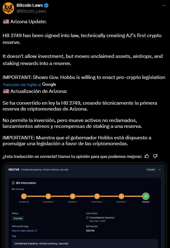 Mientras la propuesta HB 2749 se prepara para entrar en escena y el proyecto SB 1373 permanece en suspenso, la comunidad bitcoiner no se da por vencida con respecto a la ya vetada SB 1025. Esta iniciativa planteaba la creación de una tesorería estratégica dedicada exclusivamente a BTC, y, aunque logró avanzar con éxito por todas las instancias legislativas, fue rechazada bajo el argumento de que representa un riesgo para la estabilidad financiera del estado. En los últimos días, miembros de la comunidad han manifestado su desacuerdo con esta decisión, aunque es poco probable que sea revertida, ya que la propuesta no cuenta con los apoyos necesarios en ambas cámaras.