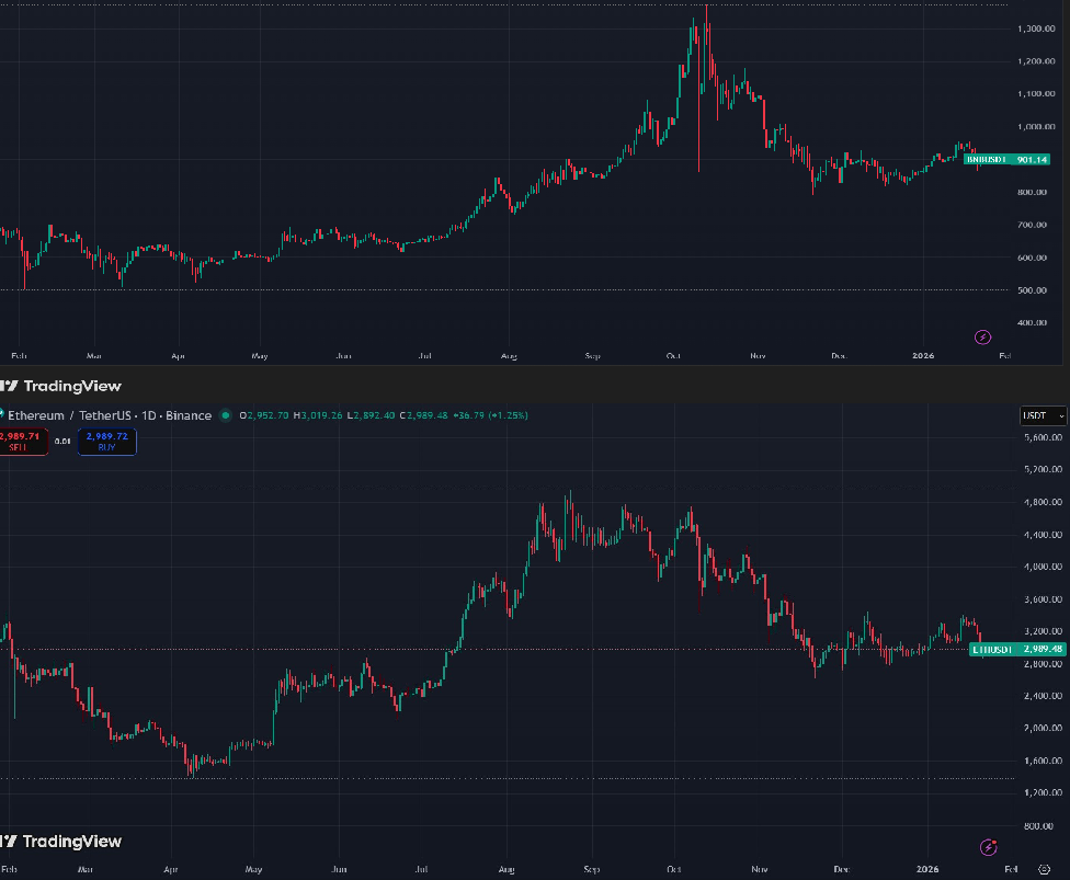 En octubre de 2025, el activo tocó un máximo histórico de 1.370 dólares. Aunque actualmente cotiza cerca de los 897 dólares, un 34% por debajo de ese pico. A pesar de ello, su estabilidad es superior a la de alguno de sus competidores.