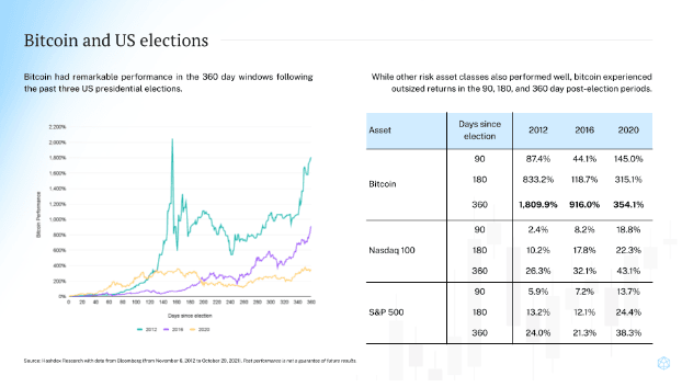 Kerbage destaca que, en períodos anteriores, el bitcoin ha ofrecido retornos masivos en años posteriores a elecciones, devolviendo un 916% después de las elecciones de 2016 y un 354% después de las de 2020, como se aprecia en el siguiente gráfico.