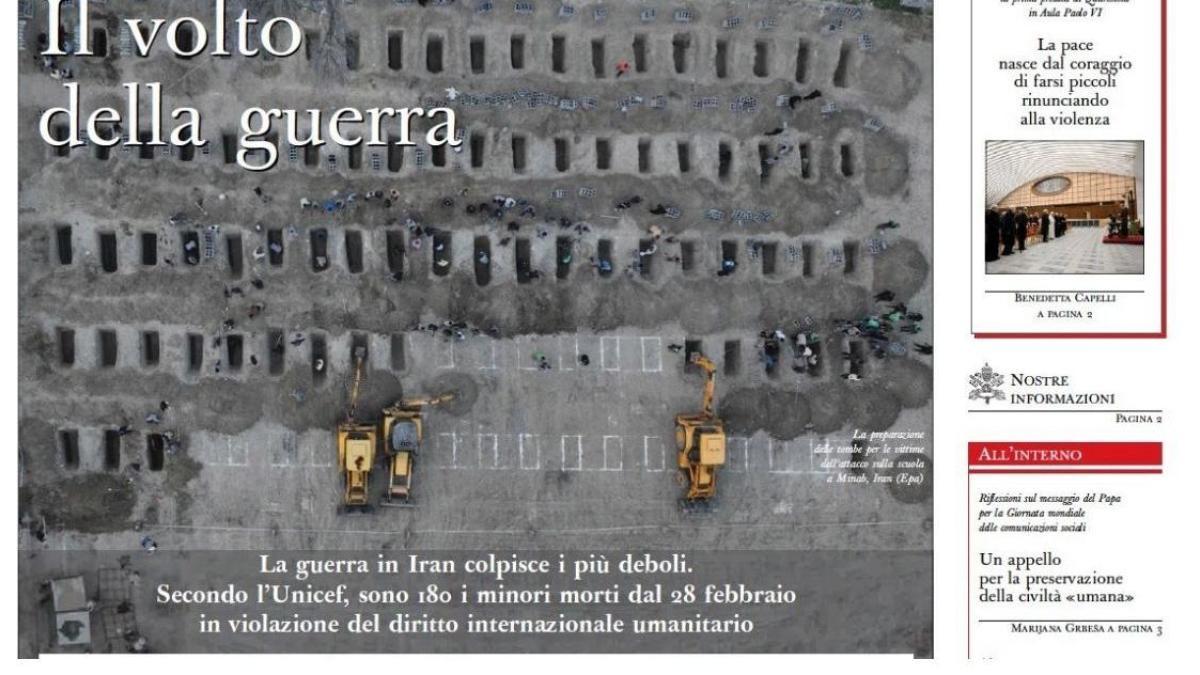El viernes 6 de marzo, el periódico vaticano abría su primera página con una sobrecogedora foto aérea de las tumbas de las 165 niñas asesinadas por un misil Tomahawk norteamericano que impactó en una escuela primaria de la localidad de Minab, en el sur de Irán, no muy lejos del estrecho de Ormuz. “El rostro de la guerra”, decía el titular principal. “La guerra en Irán golpea a los más débiles”, añadía un subtítulo. El pasado jueves, 12 de marzo, L’Osservatore abría la portada con la foto de una colcha ensangrentada, con el siguiente título: “Ya hay 1.100 ‘daños colaterales’”. Se refería al número de niños muertos desde que empezó la guerra.